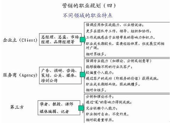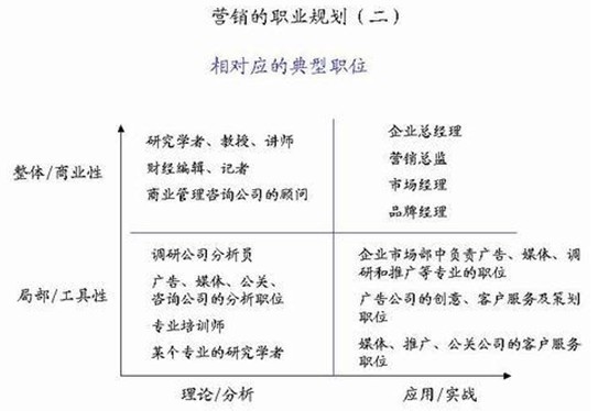 可见,在企业中的“品牌经理”、“市场经理”等职位更多偏重在营销应用及整体把握上(其中职位越高整体性越强,比如说品牌经理是针对某一个品牌/产品,而市场经理是对业务的营销规划等,到总经理是对全面经营管理进行负责);而广告/公关等服务公司虽也是针对应用来工作,但主要在某一种工具和方法;调研公司等提供数据支持和分析,以及咨询公司提供全面的商业分析,也很容易理解。