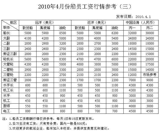 另:以上工资水平是通用海员岗位薪酬体系,具体到每一个岗位的薪酬实际值可在每个实时发布的招聘职位页面中看到,该数据是本站一大技术创新点,所显示的数据是经过科学算法得出的,具有实时参考性。